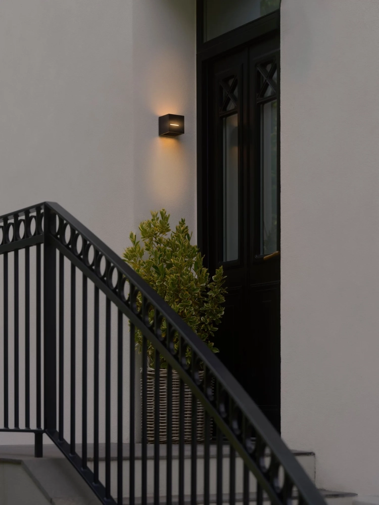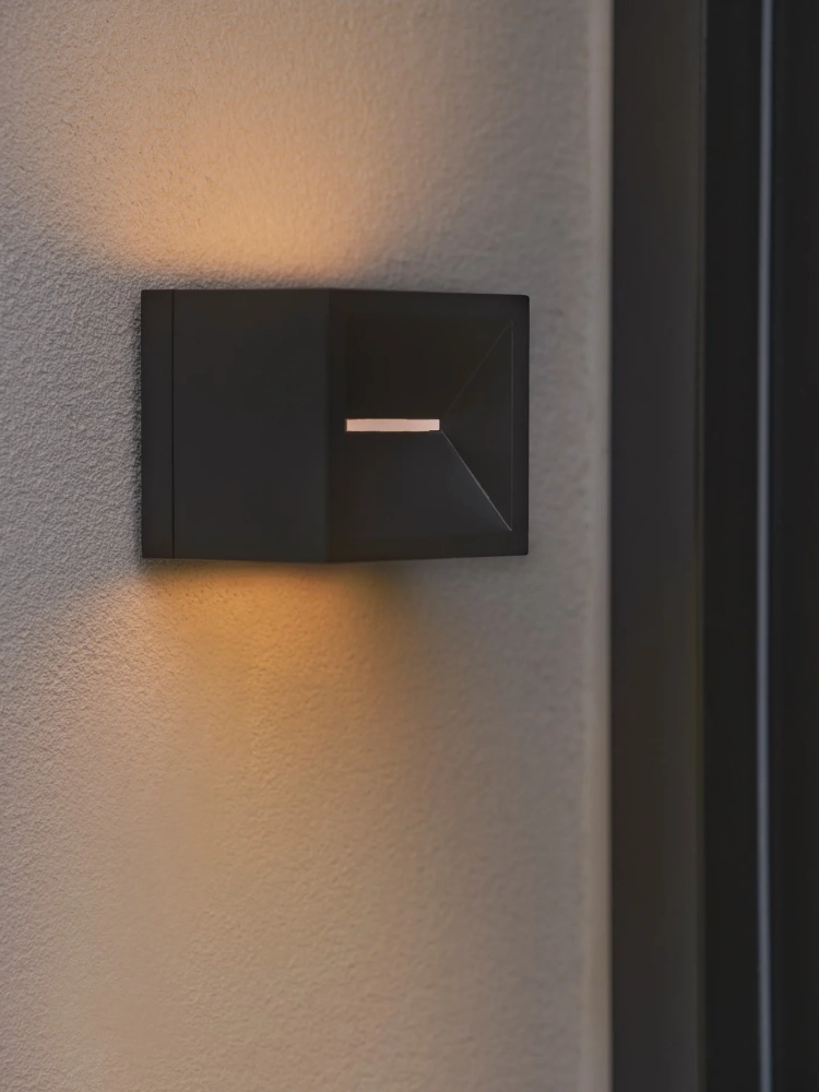 Rivo væglampen fra Nordlux er en kompakt og stilren udendørslampe med et skarpt, kubisk design. Den fylder ikke meget – men giver en overraskende flot effekt, når den bliver tændt.