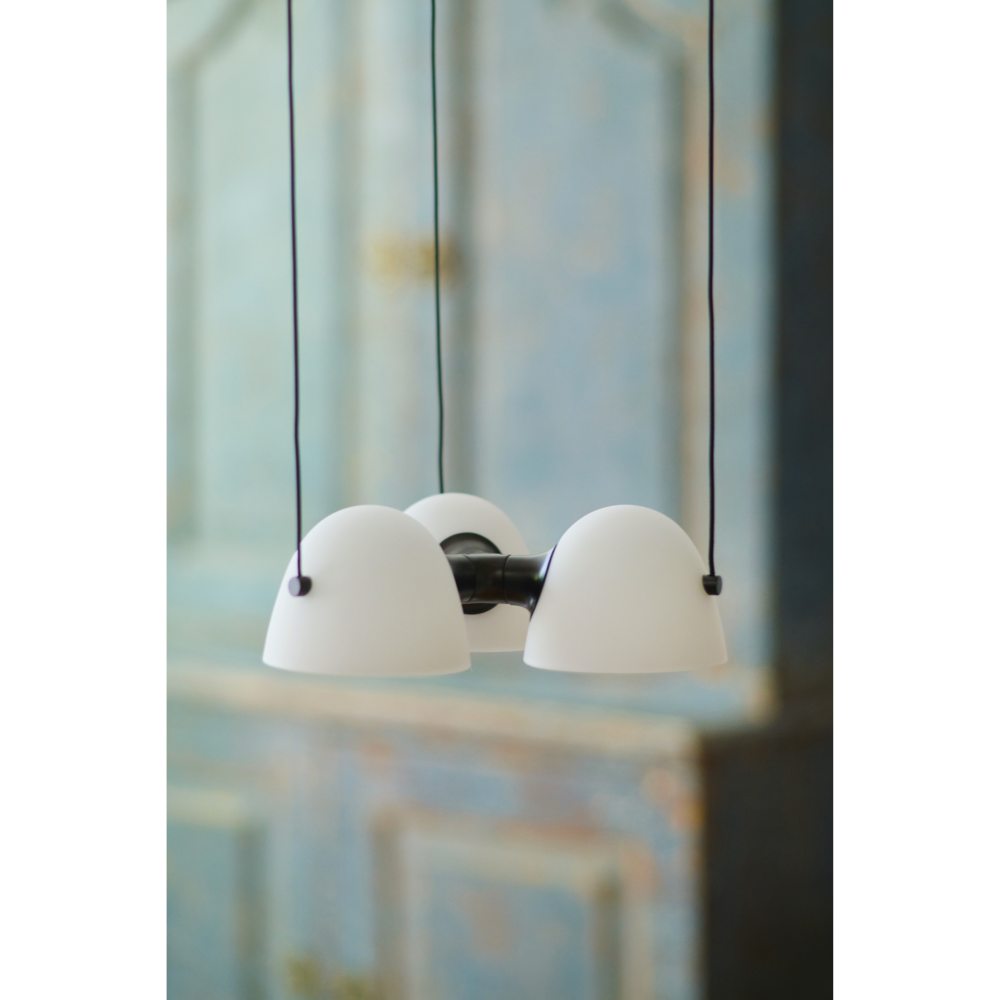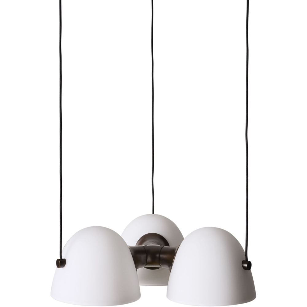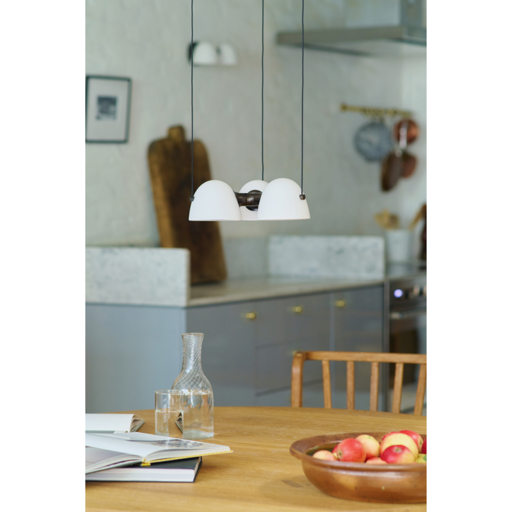 Fuse Triple Pendel er en markant og elegant loftslampe, hvor klassiske materialer og moderne æstetik mødes i perfekt balance. Lampen består af tre smukke opalglasskærme, der spreder lyset jævnt og blødt, mens de varme messingdetaljer tilfører karakter og et luksuriøst udtryk. Den skulpturelle form og de fine materialer gør Fuse Triple Pendel ideel som både belysning og blikfang over spisebordet, i køkkenet eller i stuen.