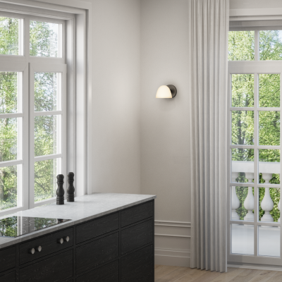 er en elegant og skulpturel væglampe, der bringer varme og ro til rummet. Med sit enkle, men raffinerede design kombinerer lampen trelags opalglas med messingdetaljer og alabaster/diffuser-elementer for at skabe et blødt, diffust lys uden blænding. Serien er karakteriseret ved en messingkomponent, som strækker sig ud og forener glasskærmen med armaturet i en harmonisk helhed.