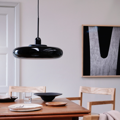 Kombinationen af den blanke sorte skærm og det sorte ophæng giver lampen et moderne og stilrent udtryk. Planet pendel - blank sort med sort ophæng er det ideelle valg, når du ønsker at tilføje et markant visuelt element til ethvert rum i din bolig.