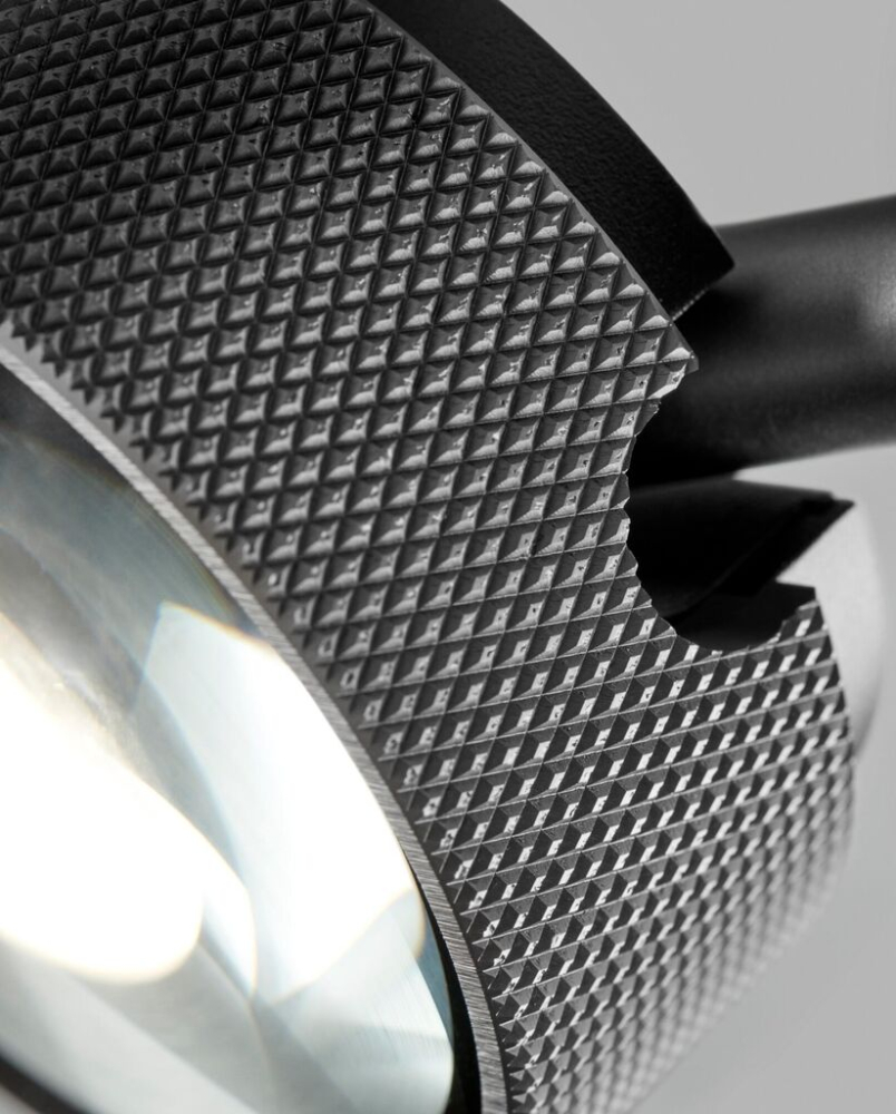 Det optiske glas skaber et blændfrit og behageligt lys, der ikke generer øjnene. Den riflede tekstur med bløde diamantfacetter tilfører dybde til den Titaniume finish og giver lampen et markant og moderne udtryk.