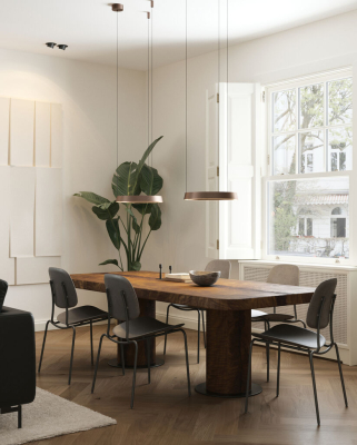 Den bredeste del af den spidse kant leverer et kraftigt og fokuseret lys til området under lampen, mens den smalleste del skaber et blødt og behageligt baggrundslys. Lyset udsendes både opad og nedad, hvilket giver en mere harmonisk og balanceret rumbelysning. Perfekt over spisebordet eller i mødelokalet, hvor både funktion og æstetik er vigtig.