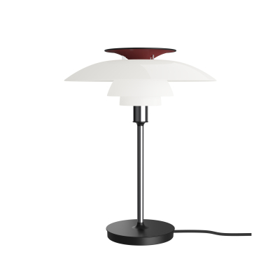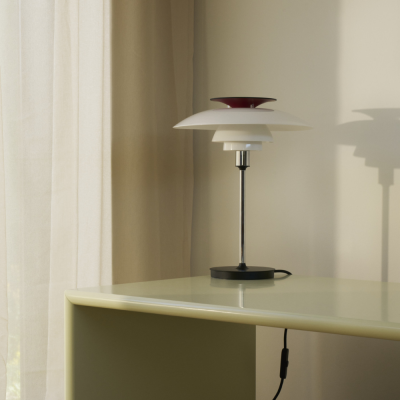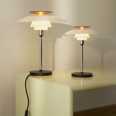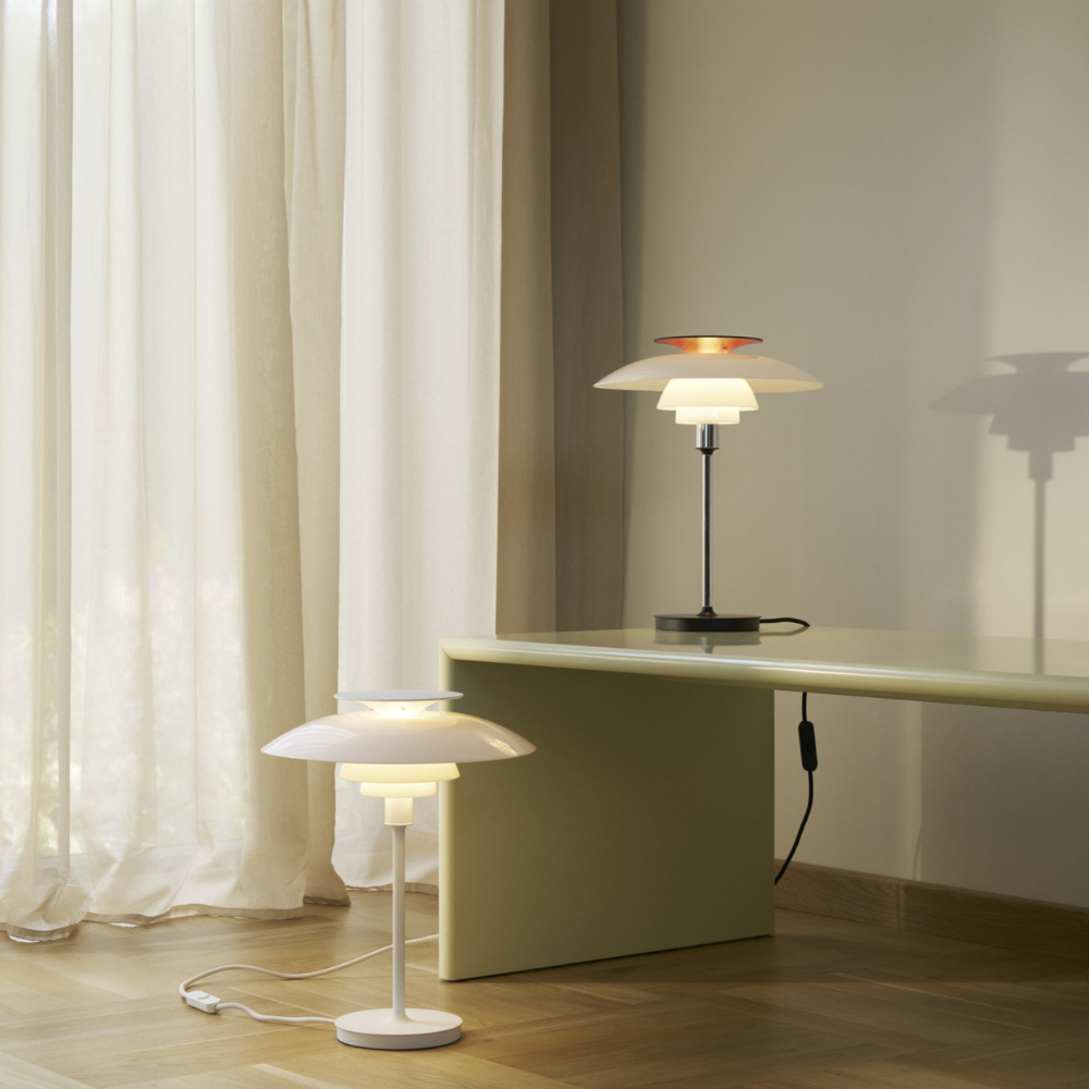 PH 80 Bordlampen er en tidløs klassiker fra Louis Poulsen, skabt med Poul Henningsens banebrydende princip om det reflekterende treskærmssystem. Denne metode sikrer et 100 % blændfrit lys, hvor størstedelen ledes nedad, mens de opale skærme samtidig spreder et diffust og stemningsfuldt lys i rummet. Resultatet er en behagelig og balanceret belysning, som både er funktionel og dekorativ.