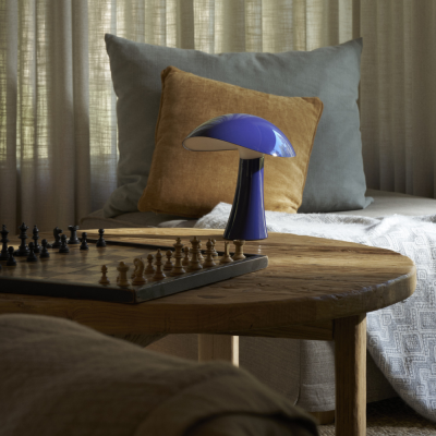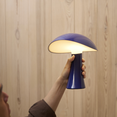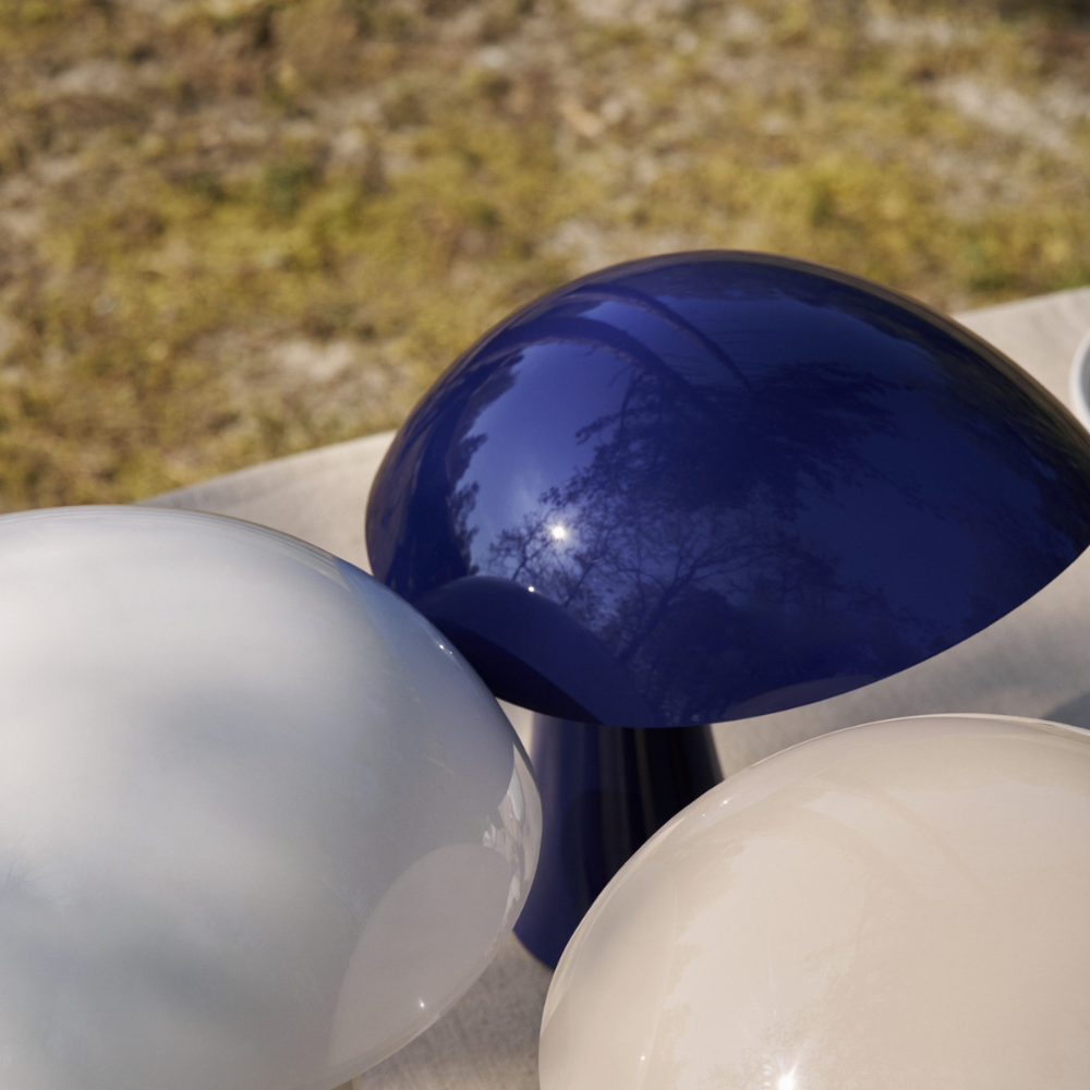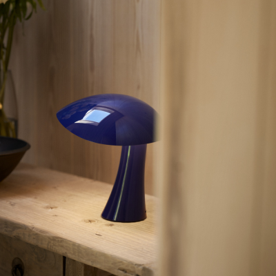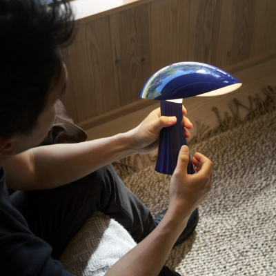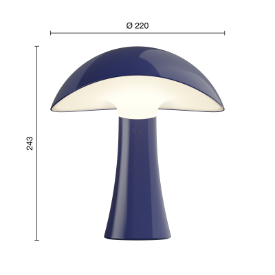 Rumee 220 Portable i farven Night Blue er en elegant og funktionel bordlampe uden ledning, designet af Gabriel Tan for Louis Poulsen. Inspireret af de bølgende kurver i en bred hat har lampen et skulpturelt formsprog, der leder tankerne mod naturens organiske former.