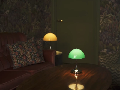 Panthella 160 Portable er en nedskaleret version af det originale design. Med en diameter på blot 160 mm er lampen nem at tage med fra rum til rum – og perfekt til både altan, terrasse og have. Her skaber den stemningsfuld belysning, uanset om den bruges inde eller ude.