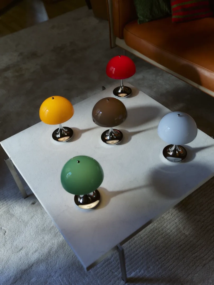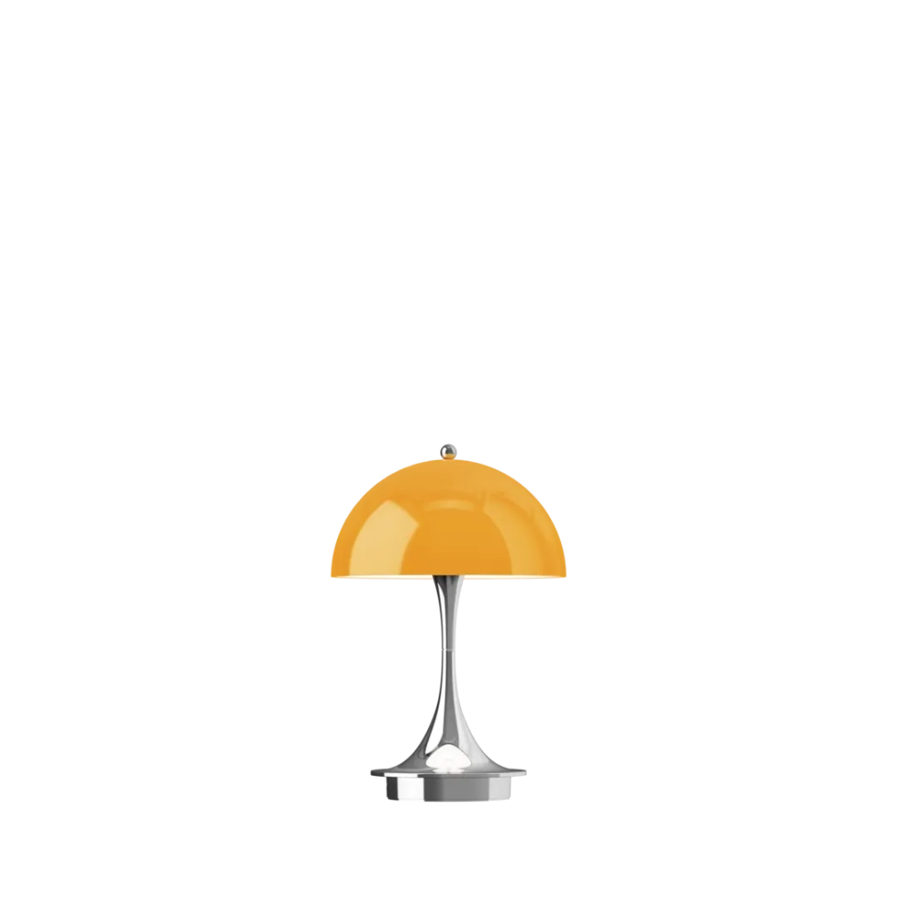 Panthella 160 Portable er en nedskaleret version af det originale design. Med en diameter på blot 160 mm er lampen nem at tage med fra rum til rum – og perfekt til både altan, terrasse og have. Her skaber den stemningsfuld belysning, uanset om den bruges inde eller ude.