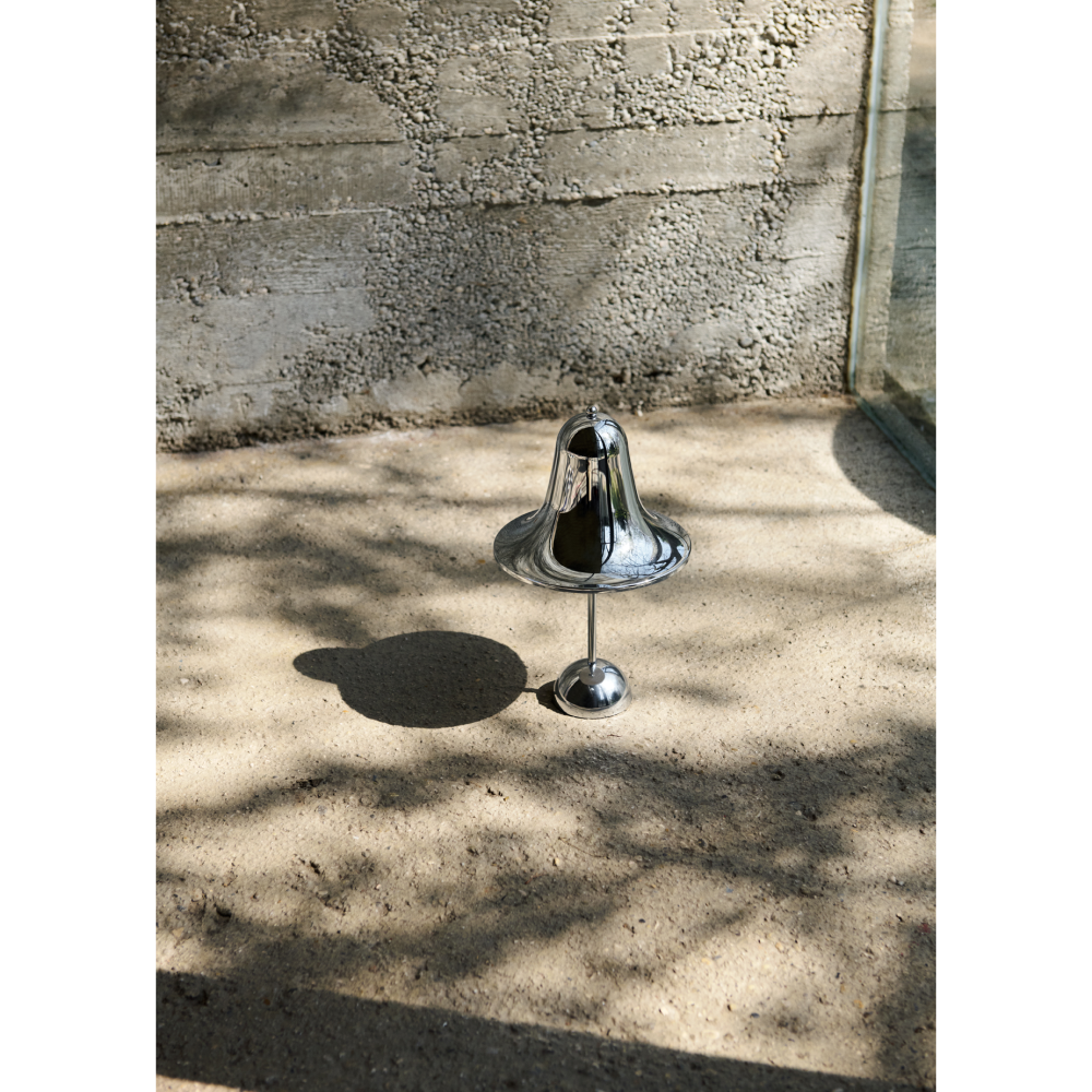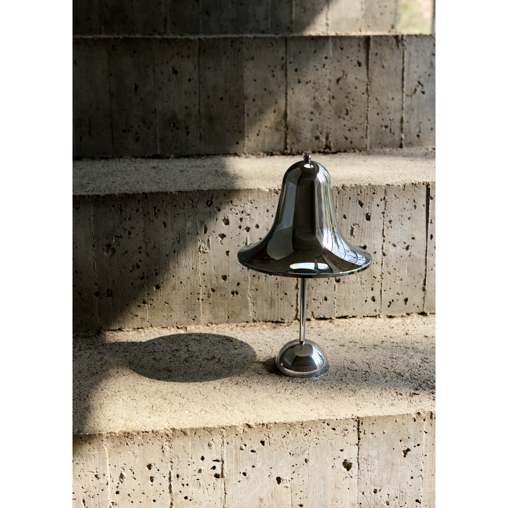 Verpan Pantop Portable er en moderne udgave af Verner Pantons klassiske Pantop-lampe fra 1980. I denne bærbare version får du det ikoniske design i en funktionel og fleksibel lampe, der kan flyttes rundt efter behov. Den skinnende kromfinish giver lampen et eksklusivt og stilrent udtryk, mens den integrerede LED-lyskilde med 3-trins dæmpning gør det nemt at skabe den rette stemning. Lampen oplades via USB-C og har en batteritid på op til 7 timer, hvilket gør den ideel til både indendørs brug og overdækkede udendørsarealer.