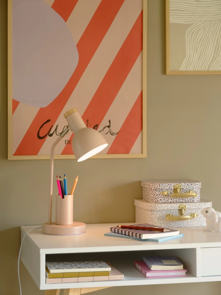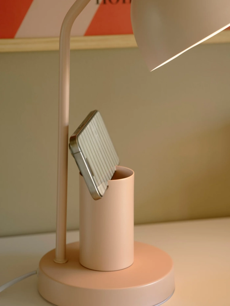 Devone bordlampen kombinerer funktion og legende design med et stilrent udtryk. Lampen er lavet af metal med en flot trætop, og den har en fleksibel lampehoved, som gør den ideel til læsning og arbejdsopgaver. Det unikke ved Devone er de indbyggede opbevaringsrum til blyanter eller telefon, som gør lampen særligt velegnet til børneværelset eller som skrivebordslampe.