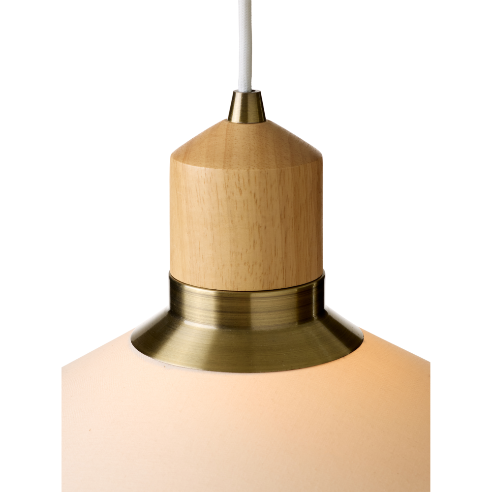 Den stofbeklædte skærm filtrerer lyset blødt ud i rummet, samtidig med at lyset sendes direkte ned gennem åbningen i bunden. Det giver en behagelig og funktionel belysning, som er ideel over større spiseborde, i stuen eller i åbne køkkenalrum.
