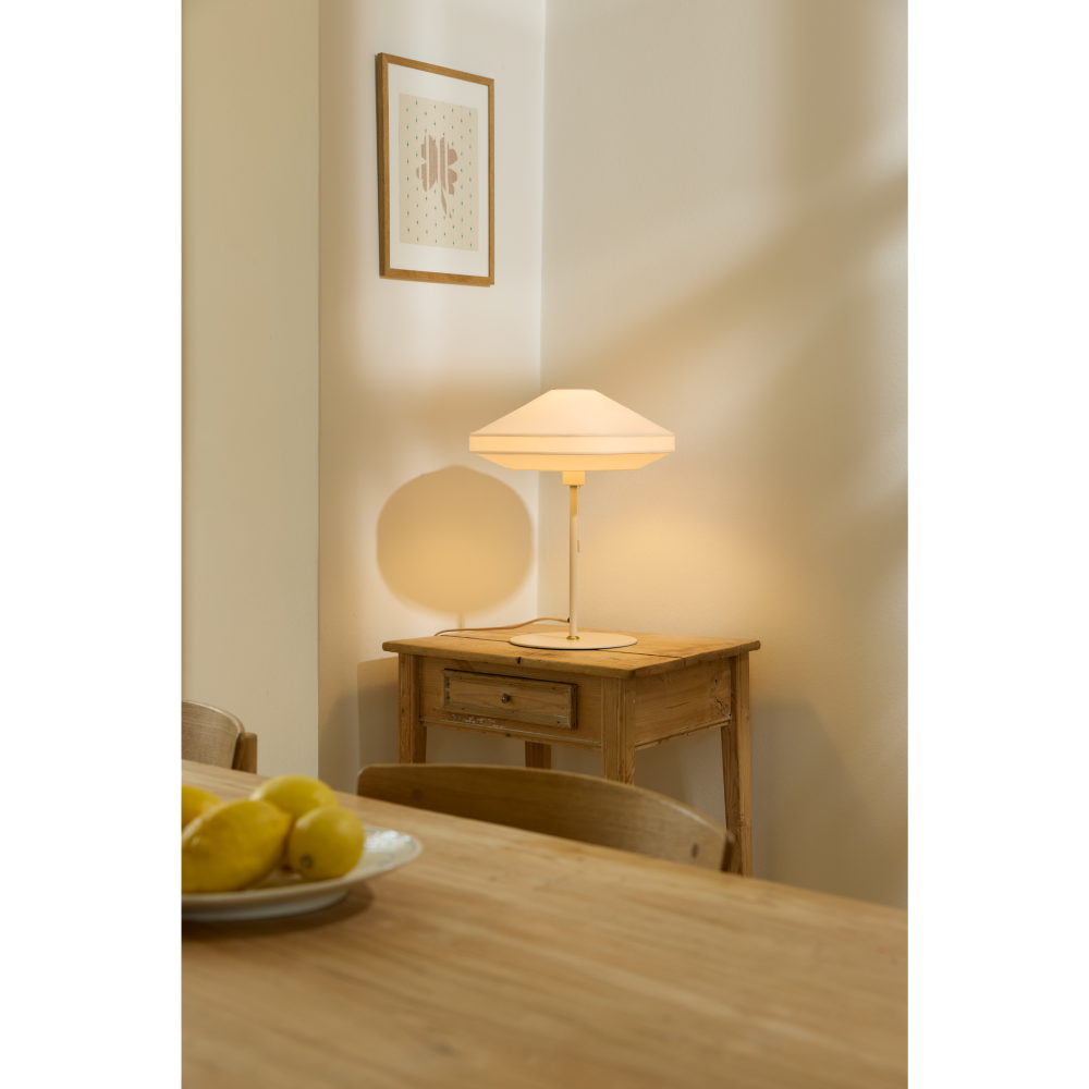 Med en diameter på 40 cm og en højde på 50 cm er lampen ideel til placering på en skænk, i stuen, i entréen eller som en dekorativ bordlampe, hvor den både fungerer som lyskilde og designelement.